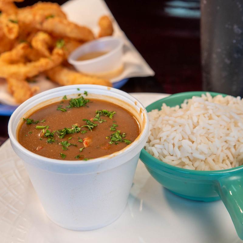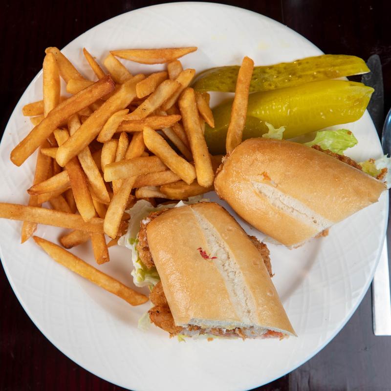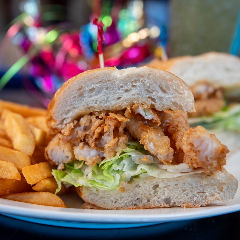 Our famous catfish strips piled high with lettuce and tomatoes on a new orleans style bread