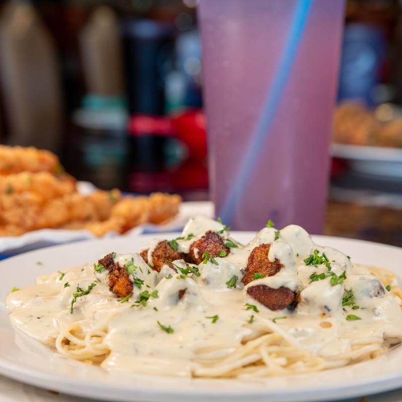 Angel hair pasta with our award-winning sauce and grilled blackened chicken, and catfish strips