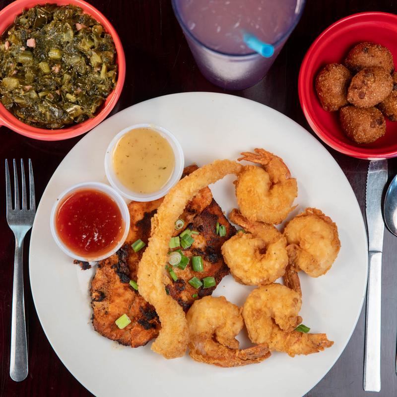5 jumbo shrimp and blackened tilapia grilled to perfection