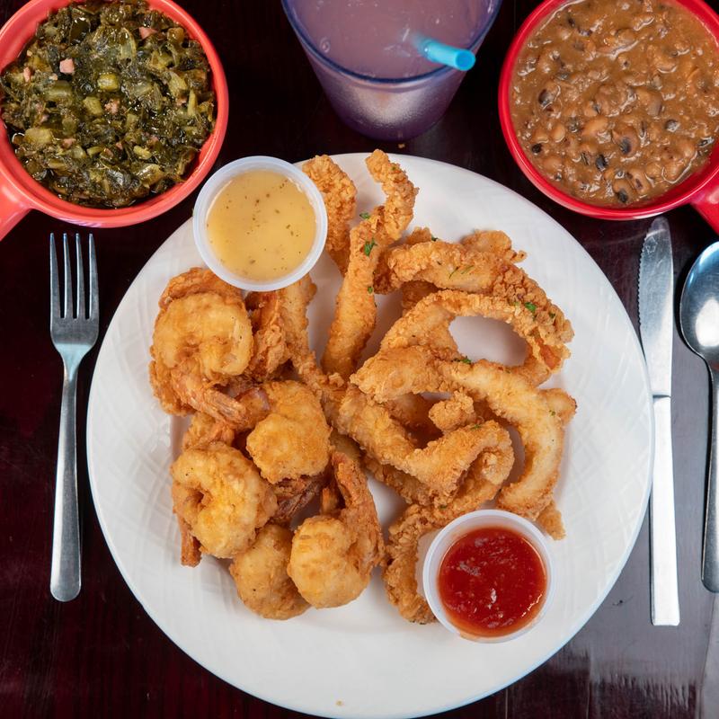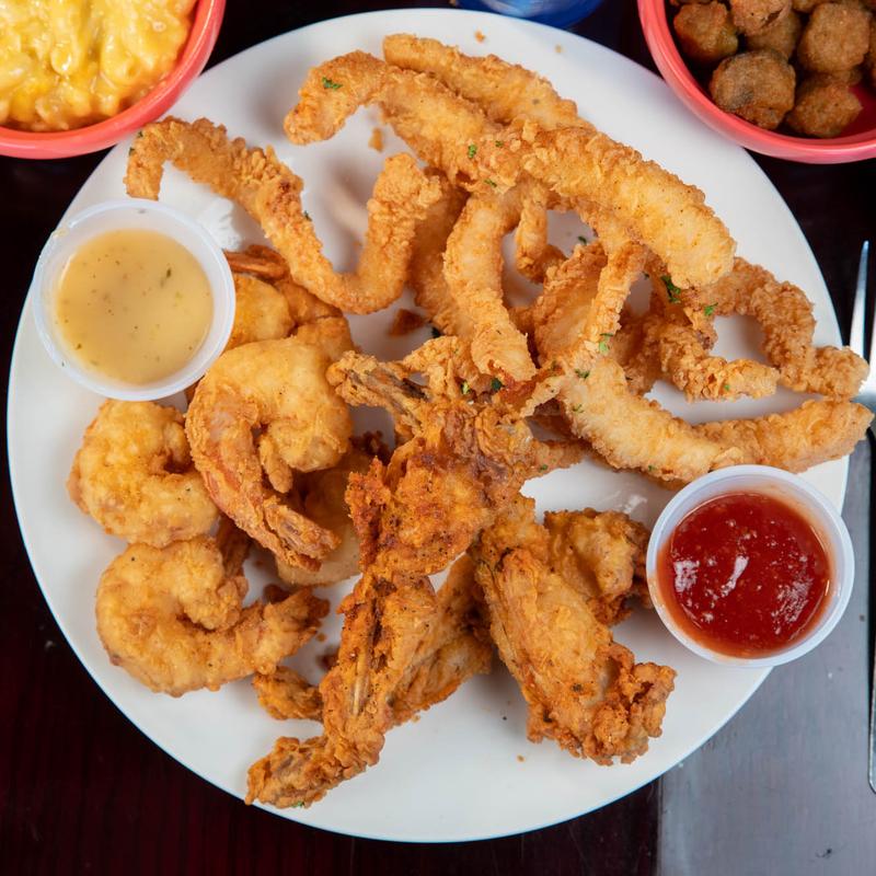 5 jumbo shrimp, 3 frog legs, and catfish strips with 2 sides