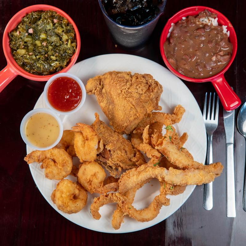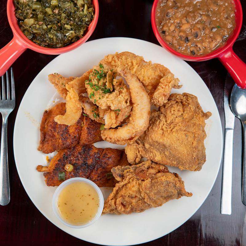 2 pieces of blackened catfish, 2 pieces chicken fried, and catfish strips with 2 sides