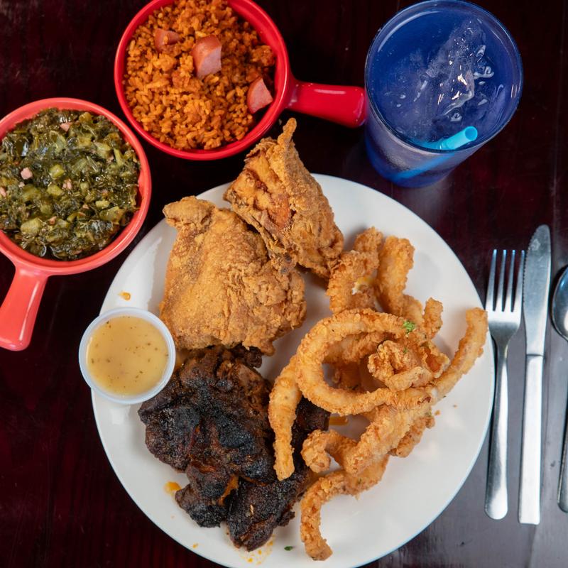 2 pieces of southern fried chicken, 3 pieces fried frog legs, and catfish with 2 sides