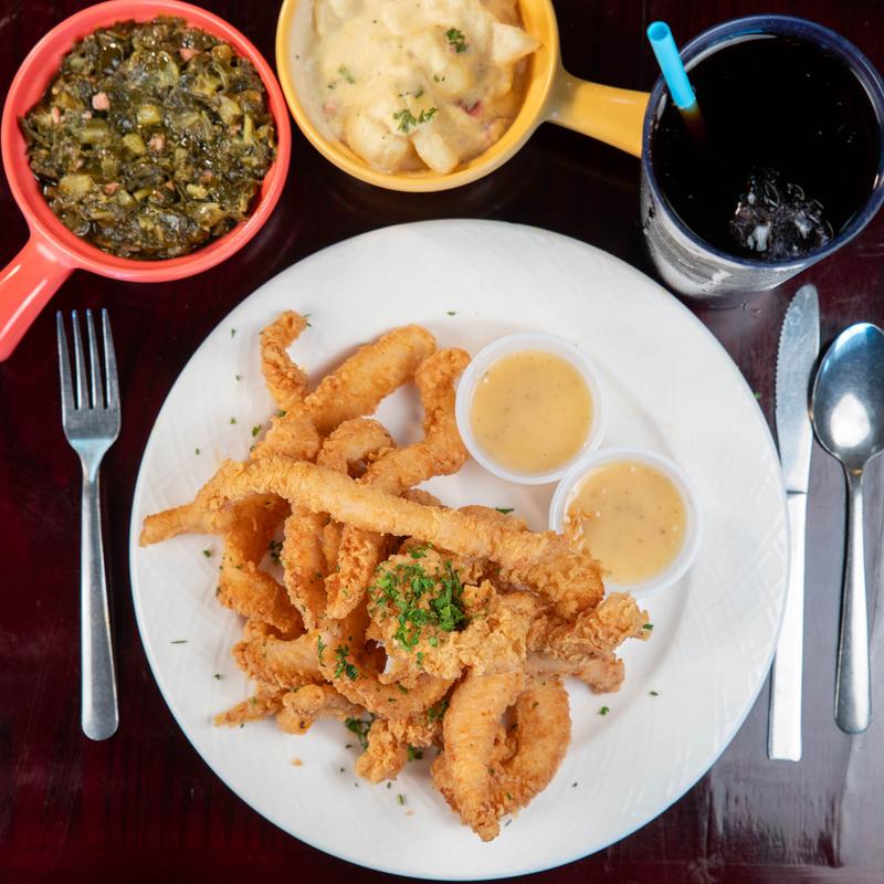 Freshly battered and deep fried tilapia and catfish strips with 2 sides